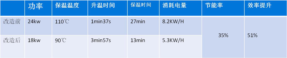 隧道爐長3米,寬0.97米,高0.23米。改造前24千瓦,達(dá)到110℃需要3分57秒,烘烤一輪需要27分鐘。改造后18千瓦,90℃就達(dá)到烘烤產(chǎn)品所需的溫度,時間1分37秒,烘烤一輪需要13分鐘。